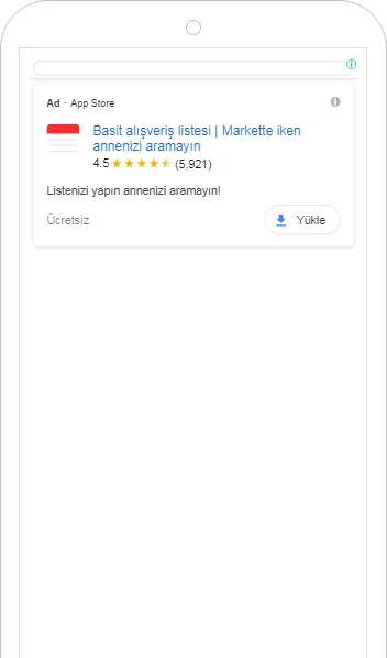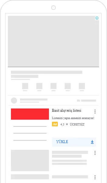 Mobil uygulama yükleme reklamlarıyla mobil uygulamanızın daha fazla kişiye ulaşmasını sağlayabilirsiniz. Bu reklamlar sadece mobil cihazlarda gösterilir. Uygulama adı ve uygulama simgesi reklamınızda gözükür. Ayrıca uygulamanızla ilgili metin, resim ve video ekleyebilirsiniz. Reklamınız Google Arama Ağı, Görüntülü Reklam Ağı, Google Play, AdMob ve YouTube’da yayınlanabilir. Kullanıcılar reklamınıza tıkladıklarında uygulamanızın Google Play’deki ya da Apple App Store’daki adresine yönlendirilir. Uygulamanız indirildikçe açık artırmaya girdiğiniz YBM(Yükleme Başına Maliyet) üzerinden ödemenizi yaparsınız.