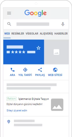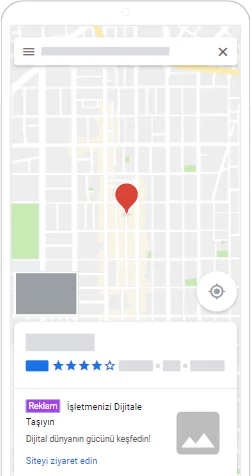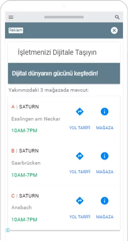 Yerel mağaza reklamları ya da diğer adıyla Google Harita Reklamları, Google’da arama yapan bir kullanıcının konumuna göre yakındaki kuruluşları tanıtan bir reklam türüdür. Bu reklamlar, Google arama sonuçları dışında, Google Haritalar uygulamasında da görünür. Bir internet kullanıcısı Google Haritalar uygulamasında herhangi bir kuruluş türünü aradığında listenin en üstünde reklamlar görünür. Örneğin, berber arayan bir kişi Google’da yada Google Haritalar uygulamasında bununla ilgili bir arama yaptığında, bulunduğu konuma yakın berberlerin listesi ile karşılaşır. Eğer harita reklam verdiyseniz, işletmeniz bu listenin en üstünde gösterilecektir. İşte bu yüzden yerel mağaza reklamları bölgenizdeki sakinleri ya da gezginleri işletmenize yönlendirmek için mükemmel bir araçtır. Bu reklamlarda işletmenizin konumuyla birlikte web sitesini, telefon numarası, adresi ve çalışma saatleri gibi önemli bilgilerde de listelenir. Reklamınız mobil ve masaüstü cihazlarda gösterilebilir, Google Arama Ağı, Görüntülü Reklam Ağı, Google Haritalar ve YouTube’da yayınlanabilir. Alttaki galeride, fikir vermesi açısından örnek bir harita reklamının mobil cihaz önizlemesi gösterilmiştir.